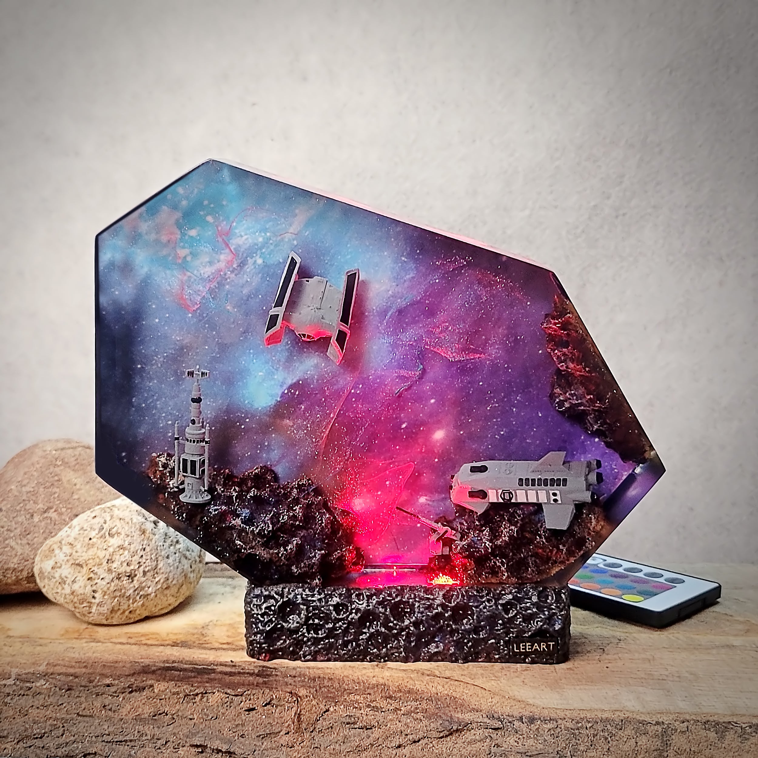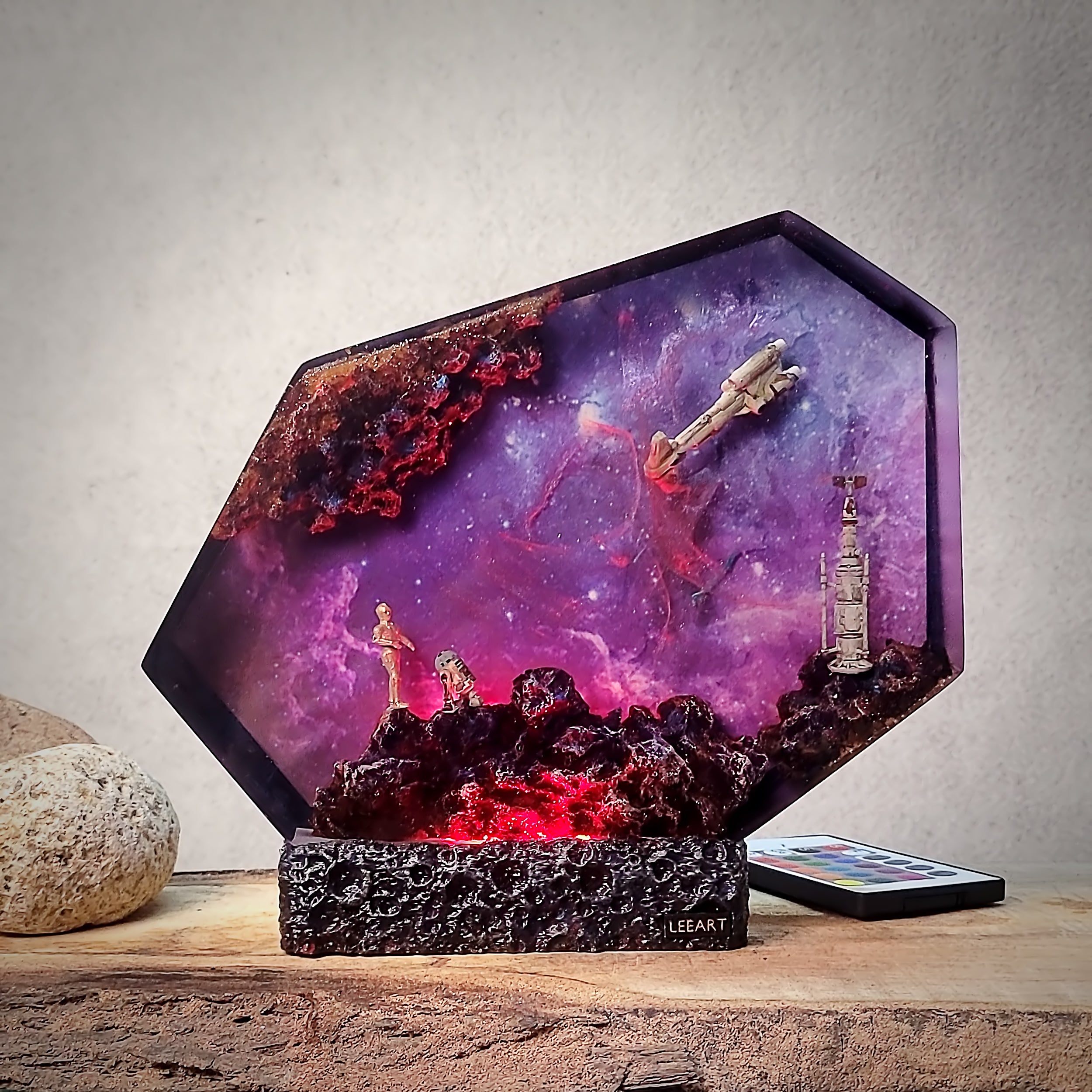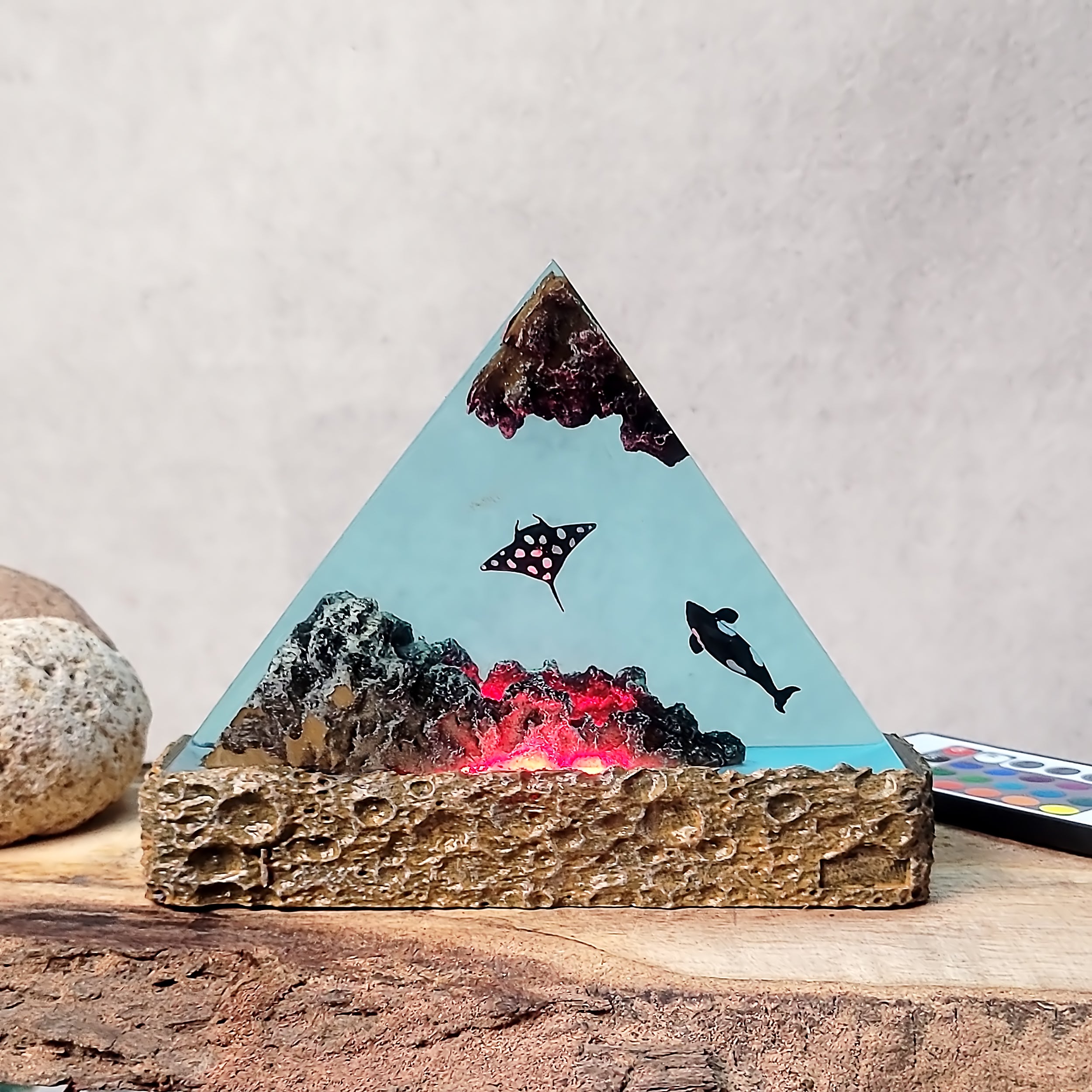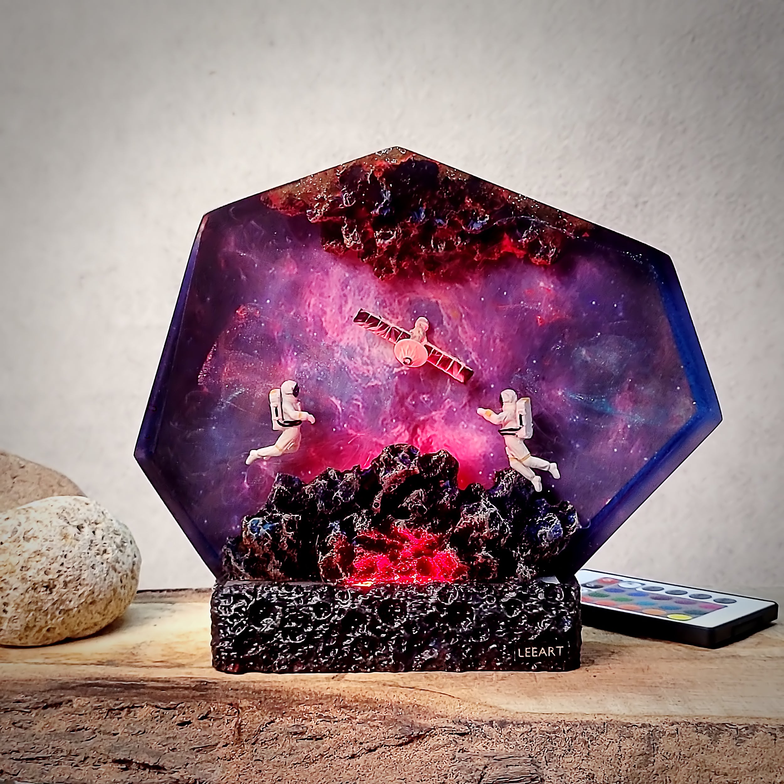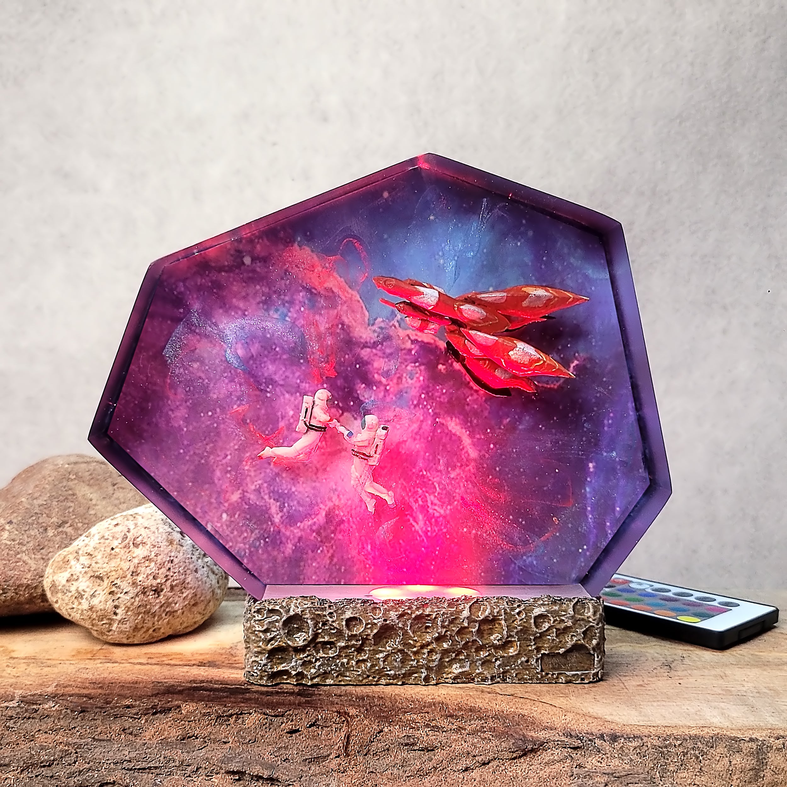 I’m a resin artist myself, and I’m impressed! This piece is flawless, and the LED lighting is soft and ambient. Looks beautiful both lit and unlit.